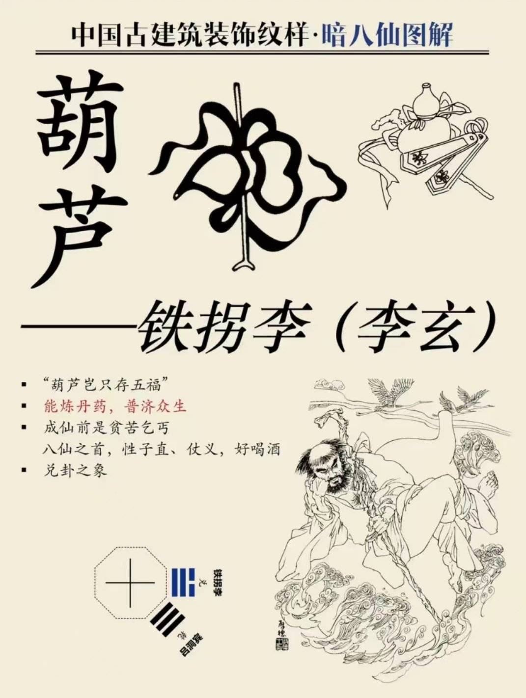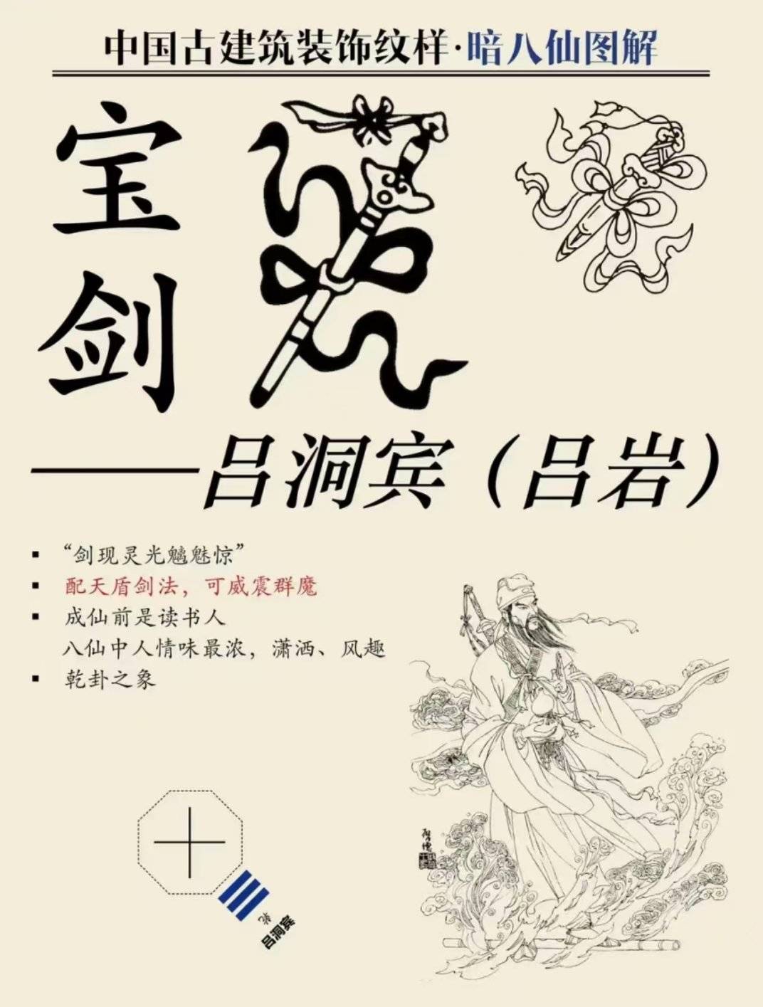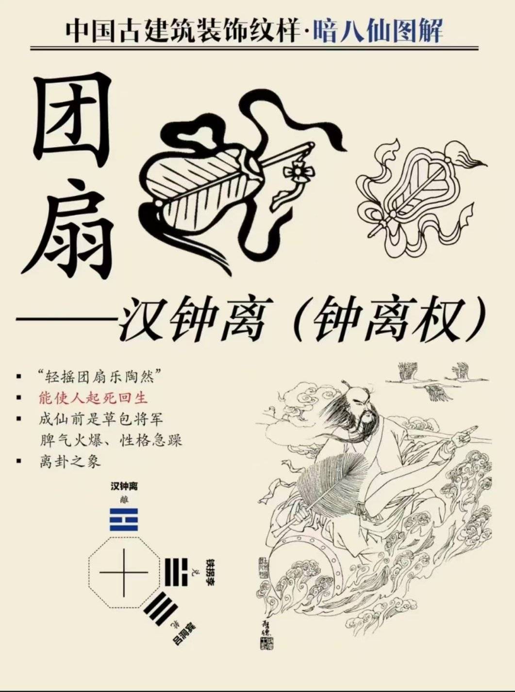 暗八仙纹最早可追溯至元代八仙戏曲中法器的图案化呈现,明末清初形成独立装饰体系。其核心元素包含葫芦、剑、宝扇、渔鼓、笛子、阴阳板、花篮和荷花等八件法器,通过器物象征替代人物形象,在建筑、瓷器、服饰等领域广泛应用,尤其多见于宗教建筑装饰中。该纹样具有祈福消灾的寓意,常被应用于屋脊、垛头等建筑细节处。