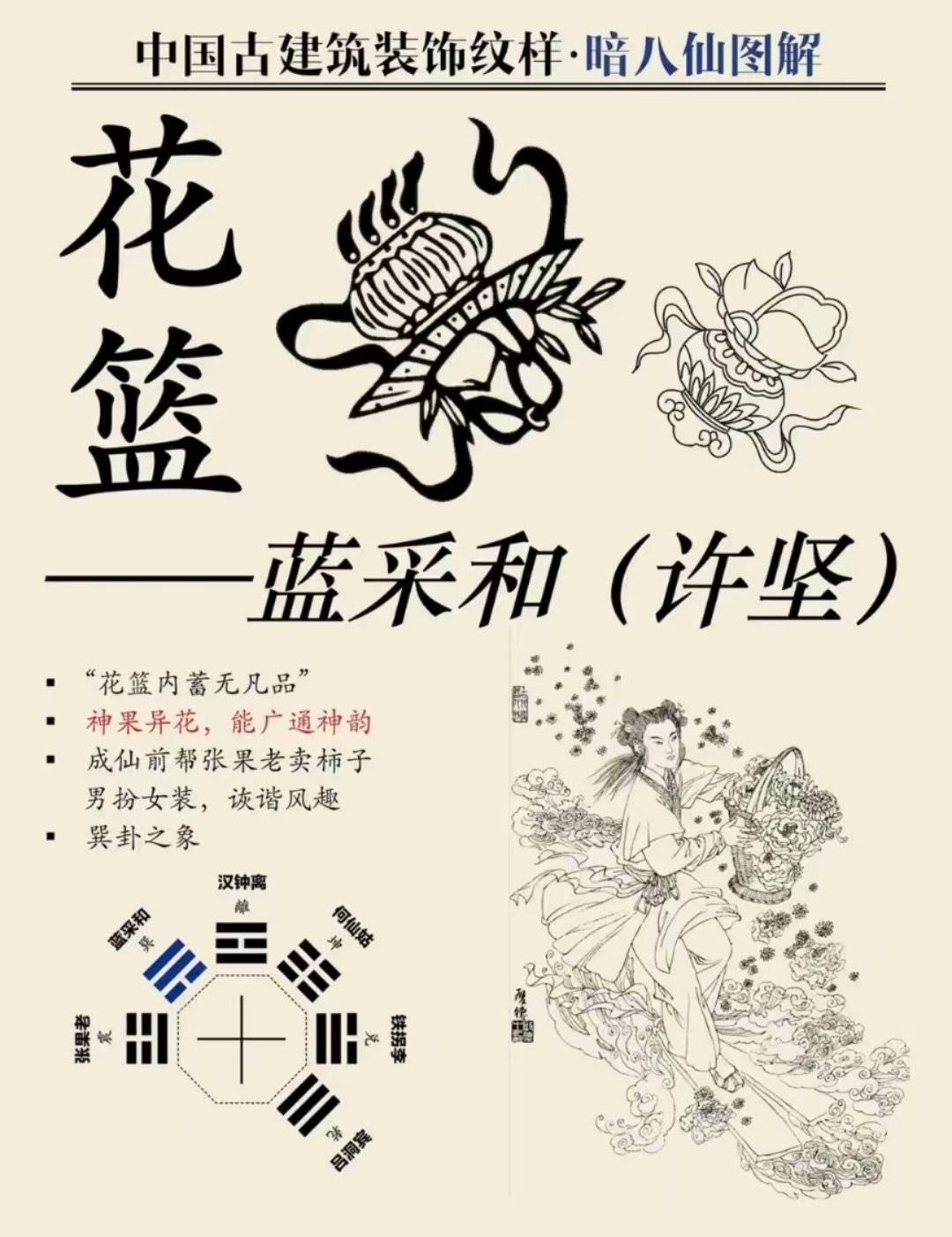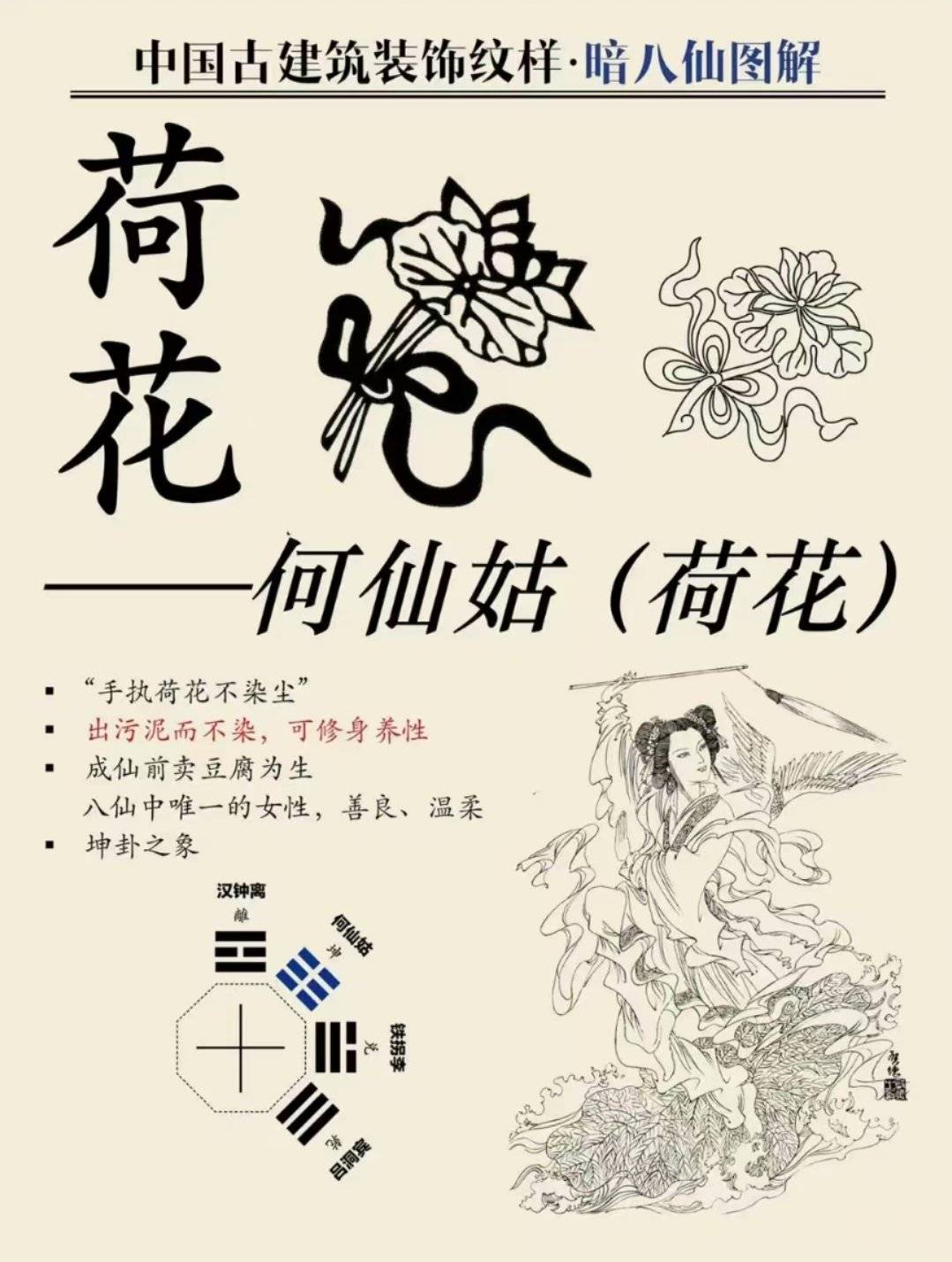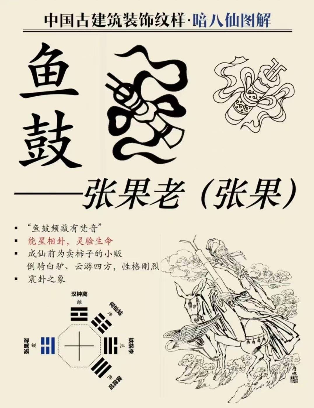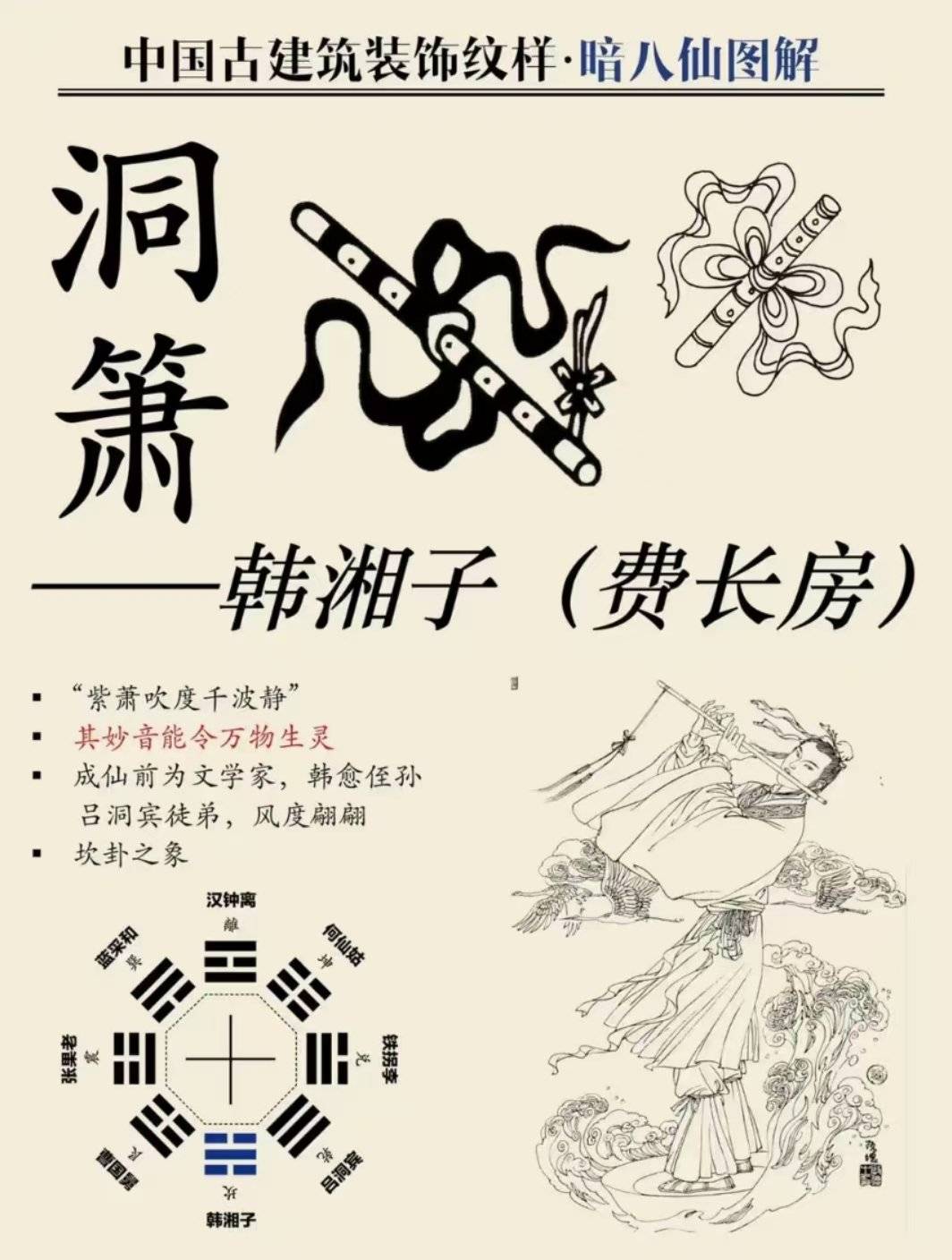 暗八仙纹最早可追溯至元代八仙戏曲中法器的图案化呈现,明末清初形成独立装饰体系。其核心元素包含葫芦、剑、宝扇、渔鼓、笛子、阴阳板、花篮和荷花等八件法器,通过器物象征替代人物形象,在建筑、瓷器、服饰等领域广泛应用,尤其多见于宗教建筑装饰中。该纹样具有祈福消灾的寓意,常被应用于屋脊、垛头等建筑细节处。