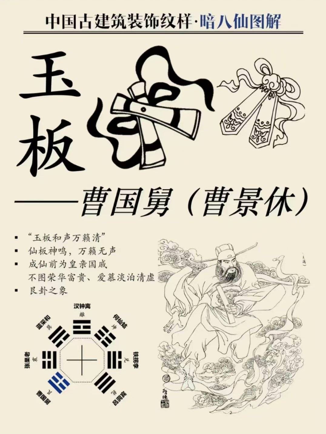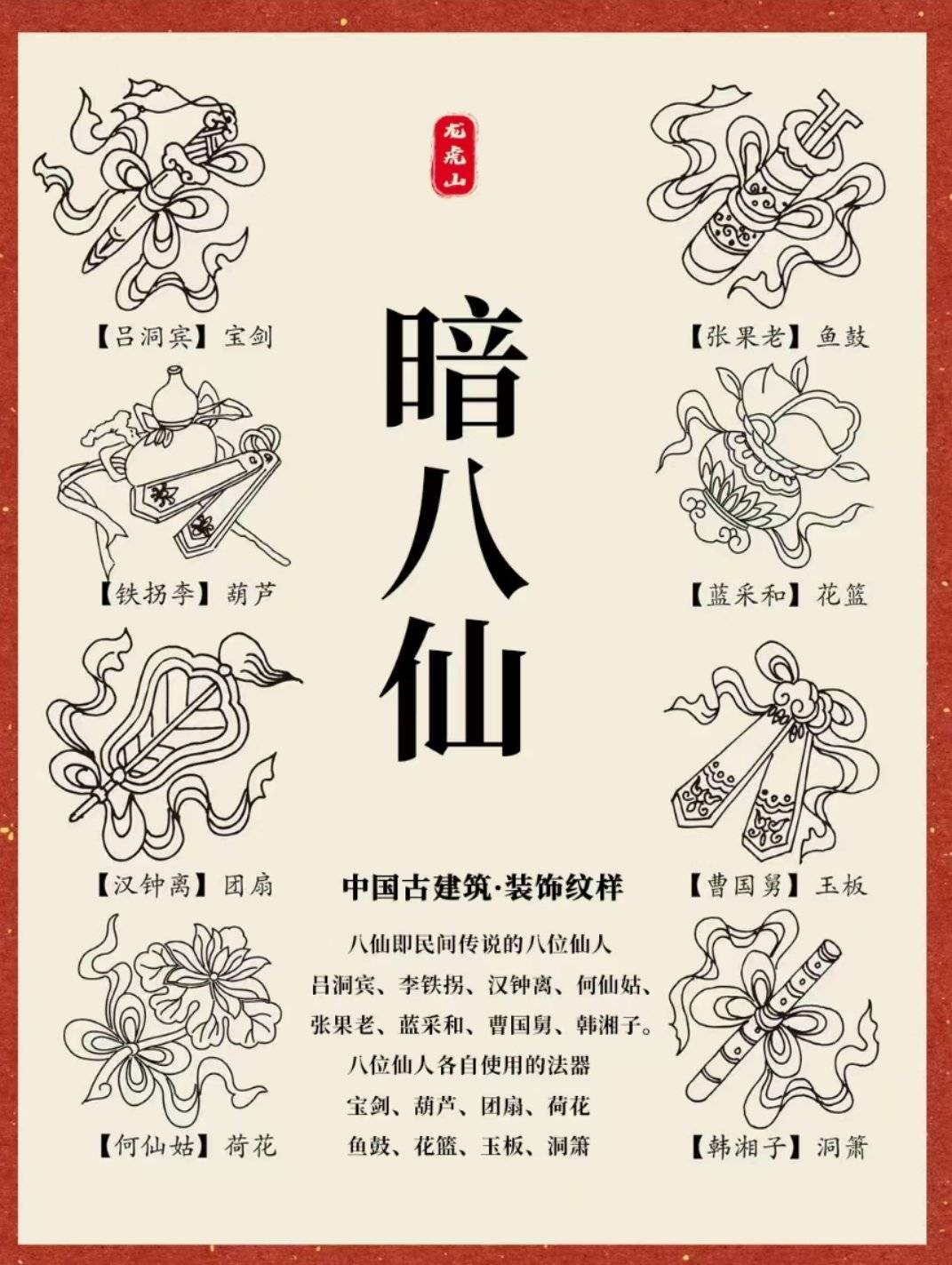 八仙指神话传说中神通广大的道家神仙铁拐李、汉钟离、蓝采和、张果老、何仙姑、吕洞宾、韩湘子和曹国舅,他们各持一件宝物,分别是葫芦、扇子、花篮、渔鼓、荷花、宝剑、洞箫和玉板,传说这些宝物法力无边,有逢凶化吉之作用,其被用作装饰图案。由于是以法器暗指仙人,所以称为“暗八仙”。